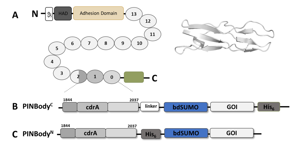 Design of PINBody fusion tags using the CdrA adhesion protein. (a) Domain organization of the full-length CdrA protein from Pseudomonas aeruginosa, including an N-terminal signal peptide (SP), hemagglutination activity domain (HAD), adhesion domain, and 14 extracellular β-strand-rich repeats, followed by a C-terminal periplasmic tail (green). Structure of repeat 0 was predicted by AlphaFold3 and visualized in PyMOL (right). Residues 1844–2037 comprising repeat 0, repeat 1, and part of repeat 2 were selected for the PINBody tag. (b) Schematic of the PINBodyC architecture, in which CdrA (residues 1844–2037) is fused to a flexible linker, bdSUMO, a gene of interest (GOI), and a C-terminal His₆ tag. (c) In the PINBodyN variant, the His₆ tag is placed between CdrA and bdSUMO, enabling purification and subsequent bdSENP1 cleavage to yield tag-free GOIs. Amino acid sequences for PINBodyC and PINBodyN are provided in Supplement information.