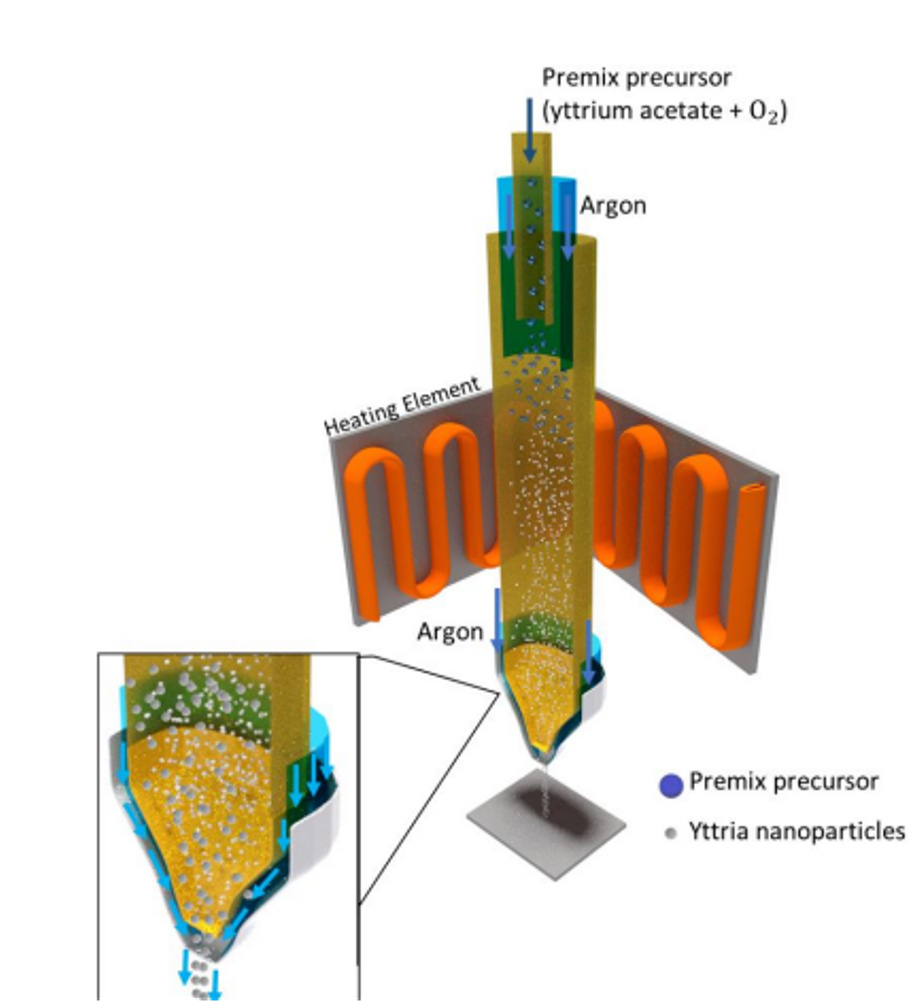 This is a print head device and apparatus for printing reactive materials as they are generated in real time. There are active reactions taking place in the print head (in one example case, yttrium acetate and O2 to deposit yttria, Y2O3 nanoparticles). The carrier gas is inert (i.e., argon), and there appear to be separate channels for the carrier gas, including within the reactor chamber at the initial feed and then a secondary flow of carrier gas in a sheath around the print head convergent on the nozzle to facilitate jetting and deposition. This technology provides the possibility to synthesize nanomaterials at the point of application with no solvent necessary, provides new opportunities for novel nanostructures and features, and eliminates the need to store and transport potentially hazardous materials.